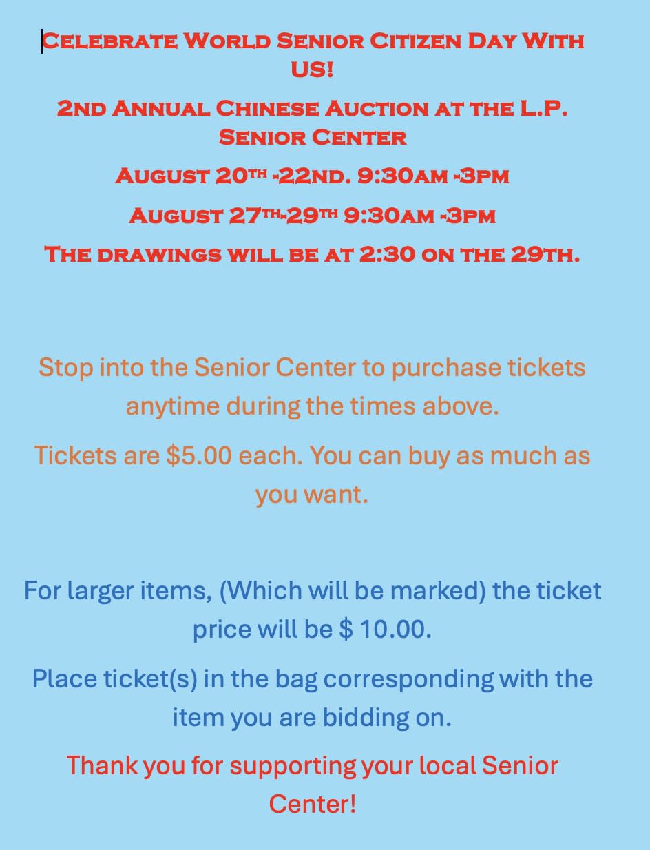 Celebrate World Senior Citizen Day with us! August 20-22: 9:30 am - 3 pm August 27-29: 9:30 am - 3 pm. Drawings will be at 2:30 pm on August 29 Tickets are purchased at the senior center for $5.00 each, and for Larger items tickets are $10.00.