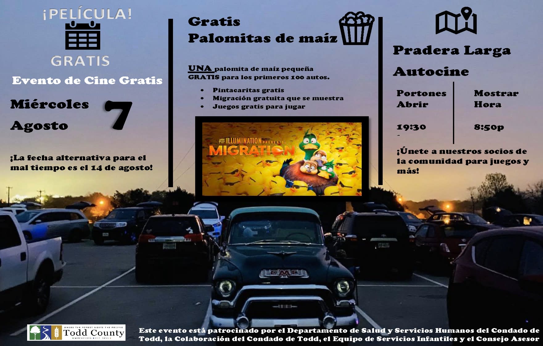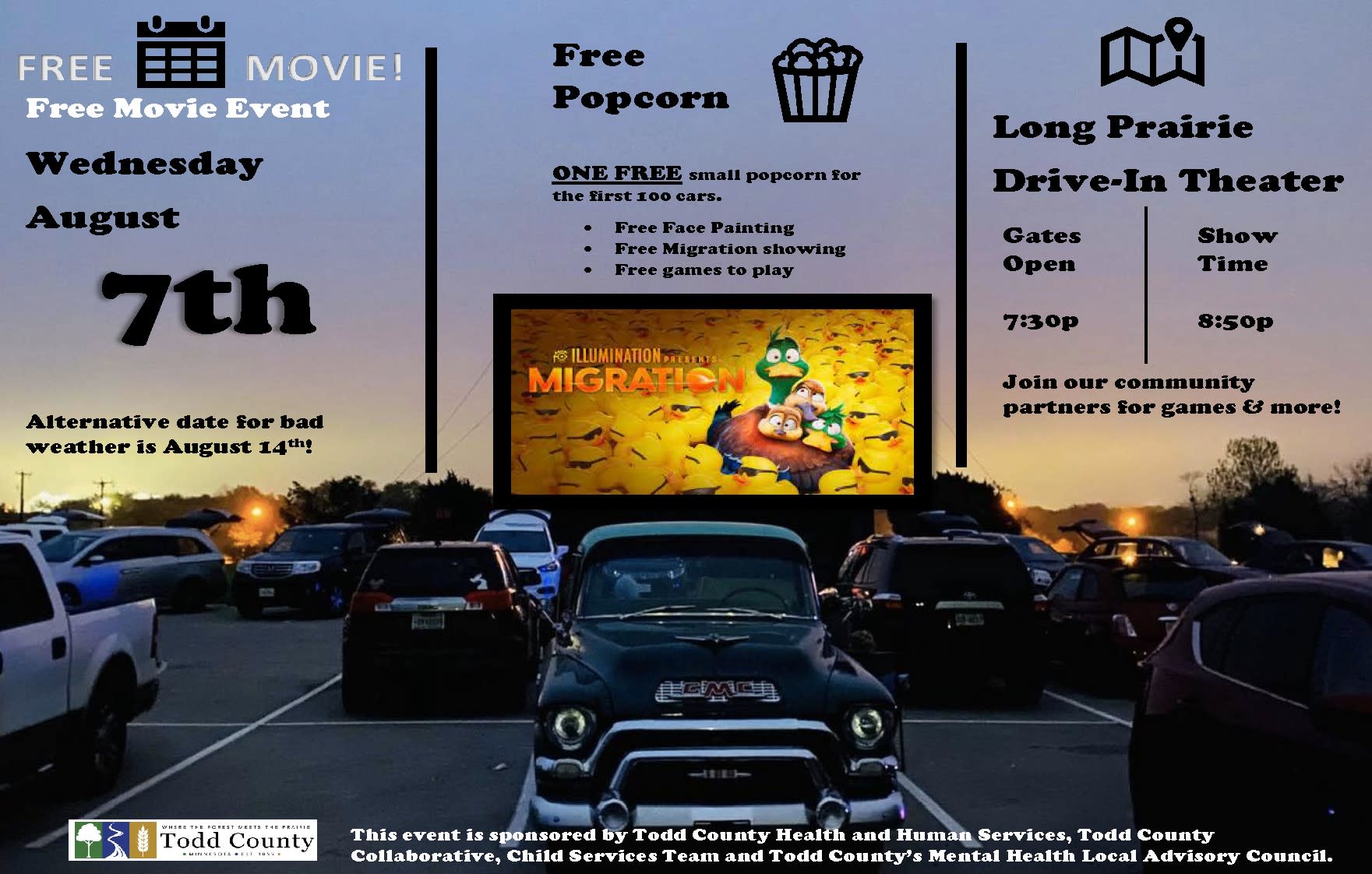Enjoy 'Migration' at the Long Prairie Drive-In with FREE popcorn, face painting, and games! / Disfruta de 'Migración' en el Autocine de Long Prairie con palomitas gratis, pintura de caras y juegos!Images