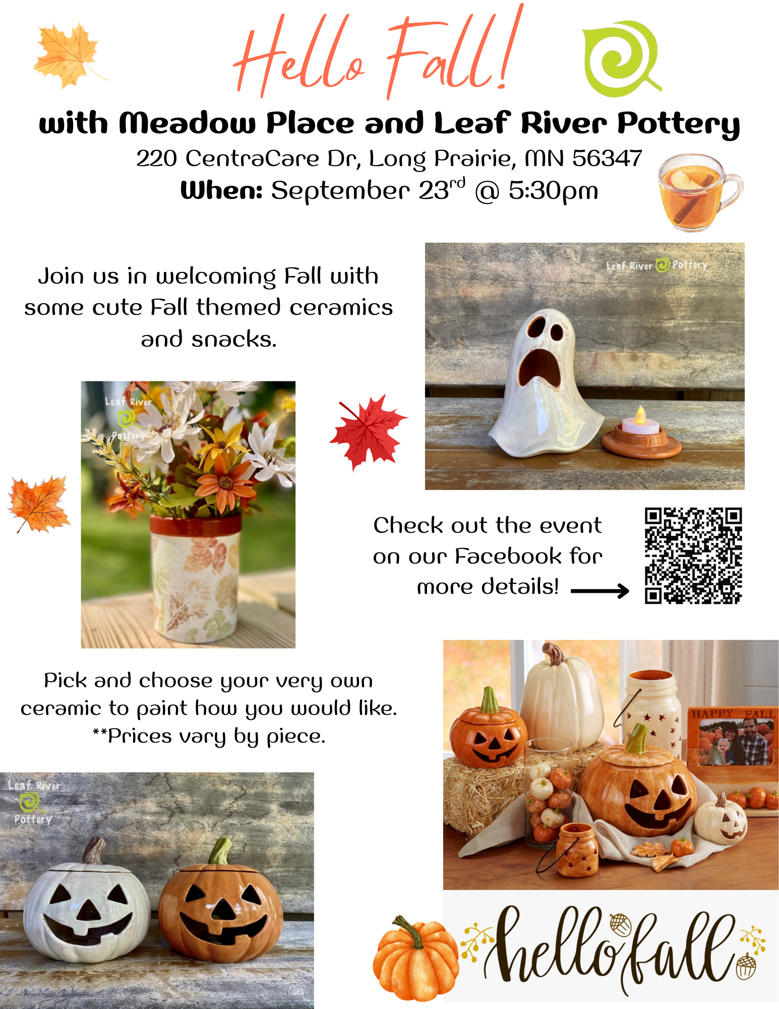 Welcome Fall at Meadow Place Assisted Living with Leaf River Pottery! Bringing in their Fall collection, You select what you would like to make and paint it to your own preference. Prices vary by piece. Once done, Leaf River will take your painted piece back and fire it in their kiln. Pieces will be available for pick up at Meadow Place about a week after.